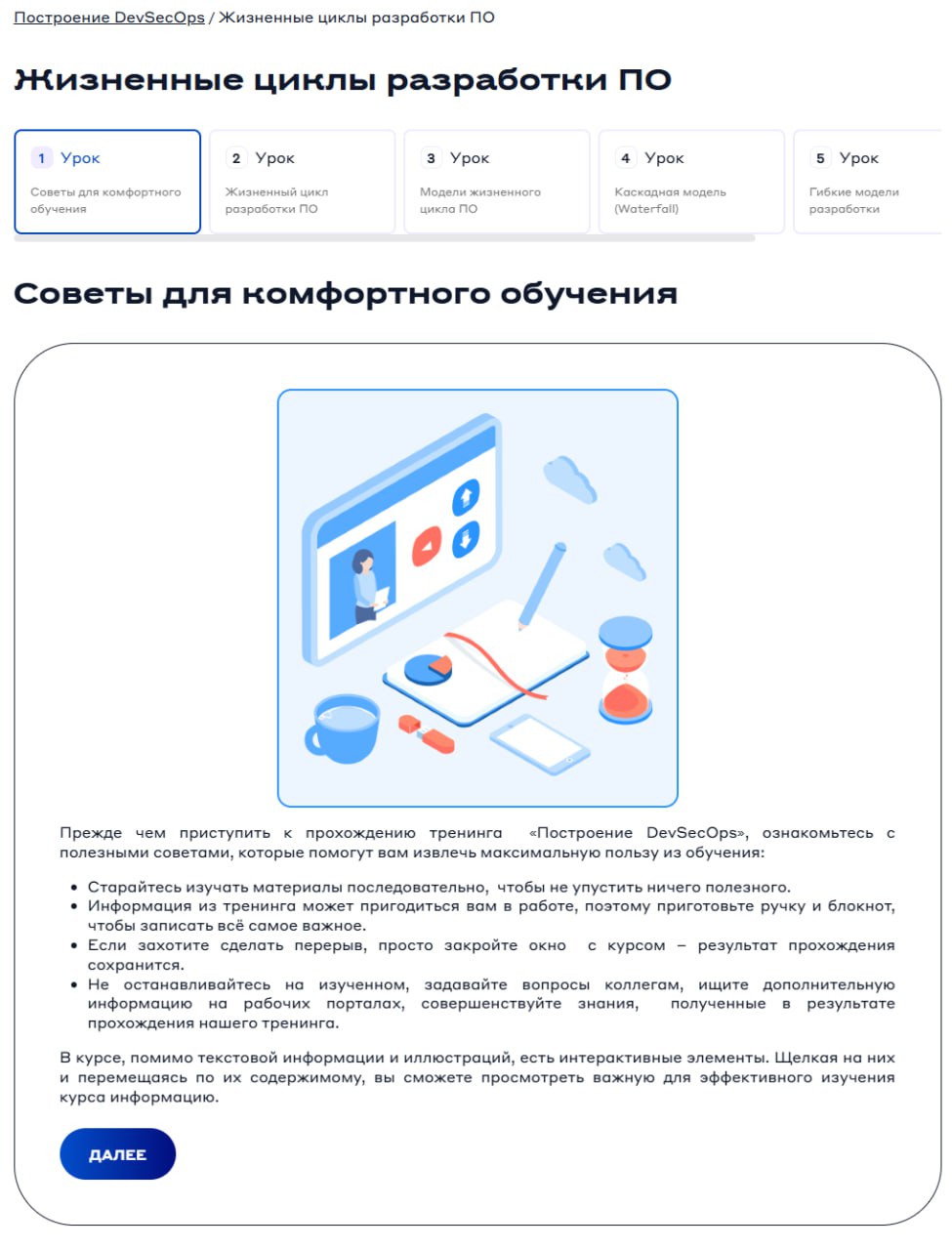 Примечание: Прогресс автоматически сохраняется после нажатия кнопки «Далее». Вы можете в любой момент прервать обучение и вернуться к тому же уроку позже.