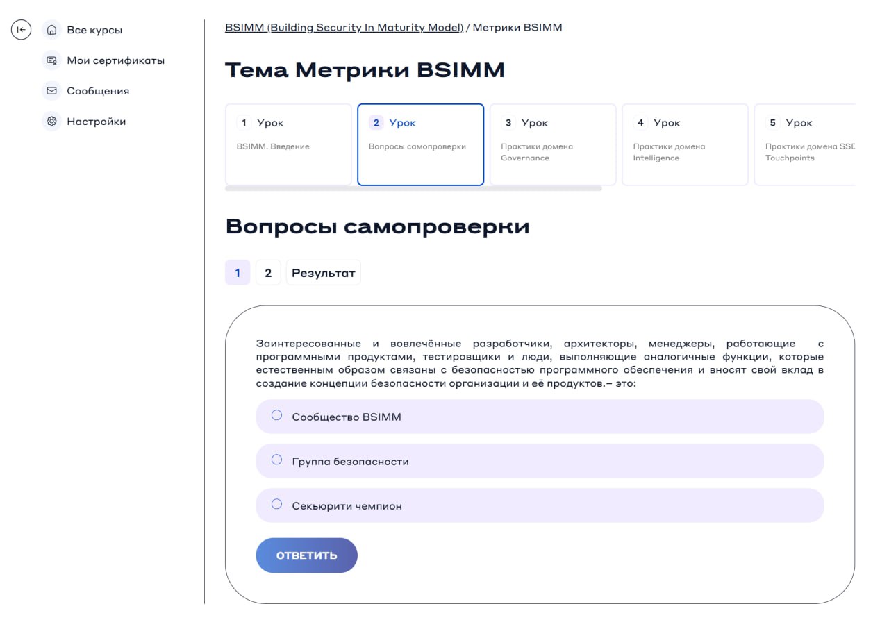 На платформе представлены два типа тестирования, которые помогают закрепить знания и подтвердить квалификацию: