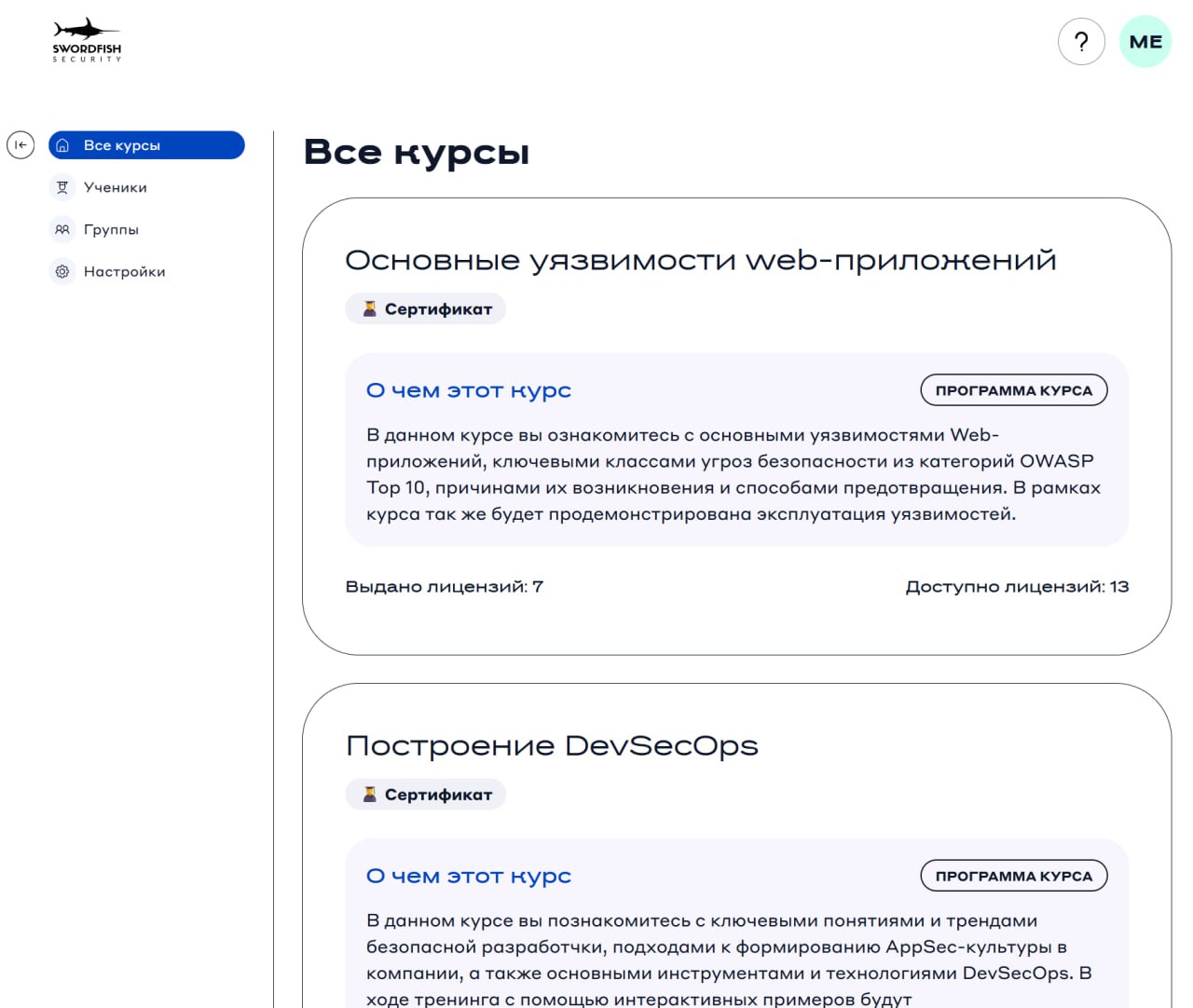 После успешного входа в систему вы попадете во вкладку «Все курсы», где отображаются все обучающие программы, доступные для вашей компании.
